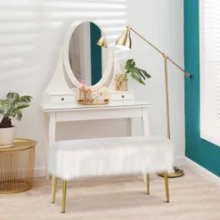 Costway Fauxfur Ottoman Bench Modern Vanity Bench Stool W/ Golden Legs WhitePink
