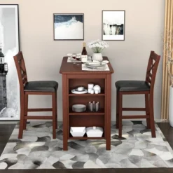 Costway 3PCS Pub Dining Table Set W/ Storage Shelves&2 Upholstered Chairs Walnut