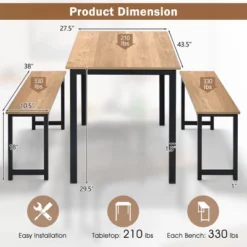 Costway Modern 3 PCS Dining Table Bench Set W/ Metal Frame & Wooden Tabletop