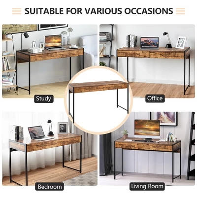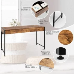 Crafted of high-quality engineered wood with sturdy steel frame, this office desk is corrosion-resistant and durable for long-term use. And adjustable leveling footpads ensure good stability and floor protection. What’s more, featuring spacious desktop and 2 large drawers, the office desk provides ample space for computer, monitor, documents and other items. It is suitable for working, gaming, writing, studying and training. Precision workmanship with realistic wood grain will add a touch of charm and elegance to your home. Clean and stylish design makes it ideal for bedroom, study, office, etc.
