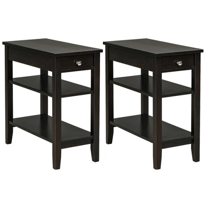 Our end table set is a perfection of style and practical value, and will add a modern touch to your room. Each nightstand has a tabletop, a drawer and two open shelves for storage, aiming to keep your room tidy and clean and bring unparalleled convenience to your life. You can keep your essentials within your reach when you couch in the bed or sofa. What’s more, this end table made of premium MDF is also stable and durable to stay by your side for long. With compact design, this nightstand is ideal for living room and bedroom, and will not occupy too much space. It is a quite good choice for you. Please don’t hesitate to buy it.