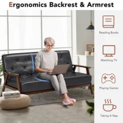Costway 3-Seater Sofa PU Leather Sofa Couch W/ Rubber Wood Legs & Button Tufted Back