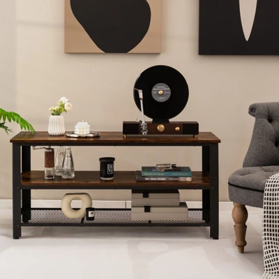 - Versatile Shelving Unit: In addition to the spacious tabletop, the versatile TV console table also consists of an open middle shelf and an open mesh shelf, which provide generous and accessible storage space for multi-media equipment and other sundries. Therefore, the shelving unit can be used as a TV console, a storage rack or a shoe rack.