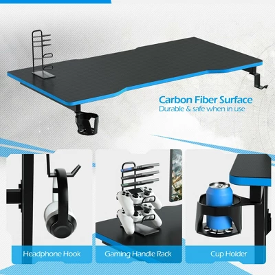 Are you still looking for a cool and sturdy gaming desk? Have a look at ours! Equipped with a crossbar and Z-shaped structure, the gaming desk has excellent weight capacity up to 220lbs. Coming with a wide desktop, the gaming desk allows you to put various items, such as your computer, keyboard, decorations, books, etc. Meanwhile, the desktop is made of MDF, which effectively enhances overall durability and the carbon fiber surface is easy to clean. Besides, this gaming desk comes with a headphone hook and a gaming handle rack which can store your things in an organized manner, and cup holder which allows you to place your favorite drinks. With gaming style, the gaming desk can help you create a gaming atmosphere.