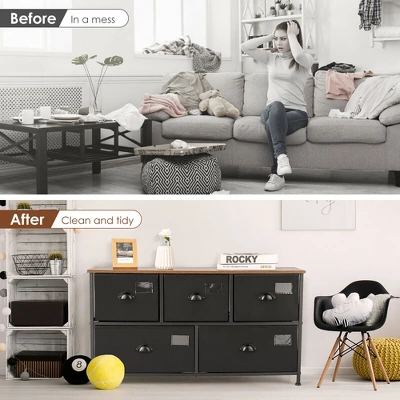 This storage organizer creates coordinated organization in your home. Made of solid metal frame and thick board, the dresser tower is sturdy and durable for long service time. It features 5 folding fabric bins, which provides plenty storage space for you. Solid tabletop allows you to display decorative plants or put something for easy access. It is also worth noting that the storage dresser includes labels for sorting the items. The compact design is perfect for small spaces and works equally well near the bed or sofa. With simple yet stylish design, this chest of drawers blends well with home decoration.