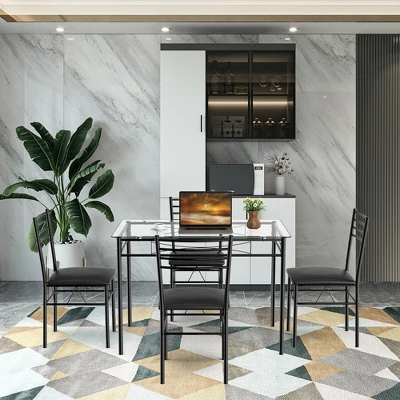 - 5 PC Combination of Furniture: 5 piece dining table set includes 1 table and 4 chairs. It is sold in a complete set. And the set comes with a glass top table and 4 cushioned chairs. The 5 pc dining table set could meet the daily needs of a family of four. Enjoy the leisure time that eat the dinner with the whole family! It is a ideal option for you.