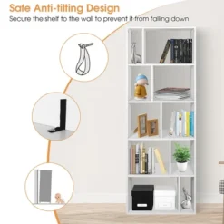 Are you looking for a piece of furniture with storage function for your home? Then this five-tier storage shelf will satisfy your needs! The five-tier structure and 10 open storage compartments provide plenty of space for your everyday items and allow you to display favorite collections or decorative items. Quality engineered wood and strong connections provide excellent load-bearing capacity. What’s more, the reliable anti-toppling device can also protect the storage rack from tipping over. You can use this storage shelf in different places, such as office, living room or study.