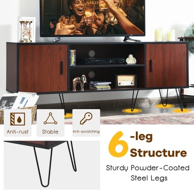 This elegant retro 59-inch TV stand will add charm to your living room. Composed of metal tapered legs and engineered boards with teak wood grain, it not only looks attractive, but also has good durability and stability. And there are two side cabinets for enclosed storage and a central open shelf, creating additional storage space in your home for media devices, electronics, accessories, books or decorations. Therefore, it can be used as a TV stand in the living room, a locker in the bedroom or a storage cabinet in the entryway.