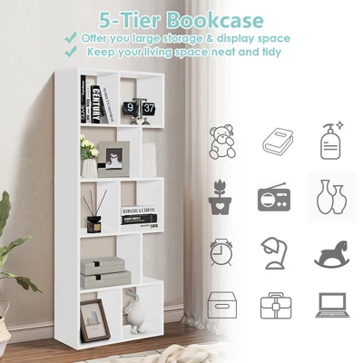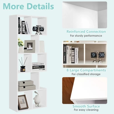 Featuring 8 open compartments, this bookshelf provides large storage space for your books, small potted plants, CDs, decorations and more. Crafted from high-quality engineered wood, this bookcase is durable and sturdy. The anti-toppling device further improves overall stability and helps create a safe living environment. With stylish appearance and practical design, this 5-tier wooden bookcase is suitable for various purposes, such as storing books, displaying collections and dividing room. It will be a great addition to your home and office.