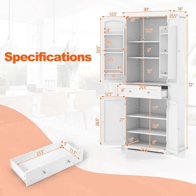 - Maximum Storage Space: This 72” pantry cabinet provides ample space to store food, small appliances or other kitchen items. It has 6 compartments in the main cabinet and 3 door shelves in each of the two upper doors. More, there is a large drawer for frequently used dishes.