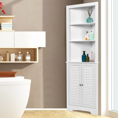 This is our multifunctional corner storage cabinet which will provide you with plenty of vertical storage space to put various items. Made of premium P2 MDF board, this bathroom cabinet is stable and durable for a long lasting use. The three-layer open shelf and a closed cabinet provide you with sufficient storage space, allowing you to organize towels, shower gel, books and other supplies in an orderly manner. The elegant and modern appearance is perfect for blending with your bathroom, bedroom and living room. If you are person who pursue a clean and orderly life, you will love it.