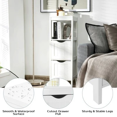 Featuring elegant lines and classic white finish, our floor storage cabinet is not only just a piece of furniture but also a great decoration for your home. This 4-tier floor cabinet comes with a spacious cabinet top, two removable drawers and one open rack, providing ample storage space for you to organize items in order and in partition. Besides, the back anti-toppling mechanism enhances using safety and the elevated bottom offers a dry storage place. The whole storage side cabinet is made of durable MDF, ensuring excellent sturdiness and high load capacity of 66 lbs. And exquisite craftsmanship enhances long service life. Plus, the polished surface and chic appearance make this display holder suitable for various occasions, such as bathroom, living room and bedroom.