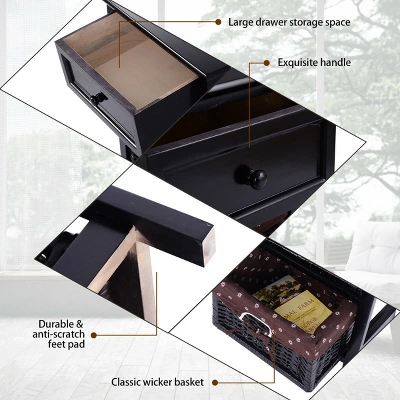 Costway Black Night Stand 3 Tiers 1 Drawer Bedside End Table Organizer Wood W/2 Baskets