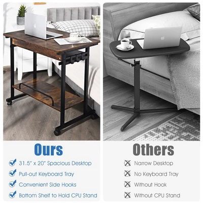 Our rolling computer desk can well suit your different demands. The combination of keyboard tray, side hooks and open shelf allows you to store office supplies or daily items in various sections. Moreover, the spacious desktop makes it easy to pick up items and see them at a glance, keeping your items at hand. Durable engineered wood and solid steel frame enhance high-strength support. Equipped with 4smooth-rollingcasters,this computer desk is easy to move anywhere as needed. Industrial style perfectly decorates your home and office.