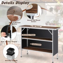 - High-Grade Material: The main structure of the camping table is constructed of top-grade aluminum which is rustproof, anti-deformation and super sturdy. The oxford cloth is waterproof and wearable, and the hook and loop fasteners make it easy to attach to the table, thus preventing the items on the shelf from falling down.