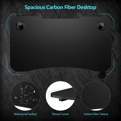 - Spacious Carbon Fiber Desktop: The 43.5” x 23.5” spacious tabletop provides ample space to hold your laptop, monitor, keyboard, books and other desk accessories. Besides, covered with high quality carbon fiber texture, the tabletop surface is waterproof, scratchproof and skin-friendly, offering you a better gaming experience.