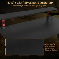 - Spacious Desktop with Monitor Shelf: 47.5” x 23.5” wide gaming surface with an additional monitor stand shelf provides ample spaces for all your required gaming gear. It can easily accommodate your monitor, keyboard, laptop, mouse pad and other necessities, providing endless fun gaming time.