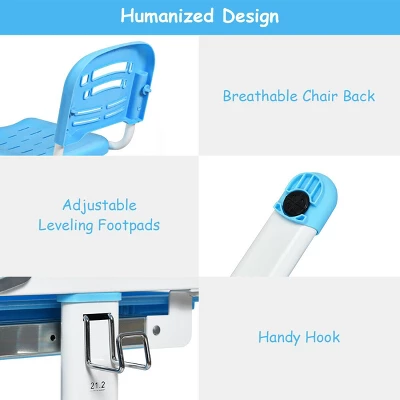 Our kid’s desk and chair set is your child’s ideal learning partner! The height of the desk and chair is adjustable, which helps kids have a perfect sitting posture. And the desktop of student desk can be tilted from 0-40 degree angle to protect their eyesight. What’s more, the desk features an embedded pull-out drawer for storing pens, books, papers and other little things to reduce clutter. Our multifunctional study desk and chair set combines practicality and fun. It is really a perfect gift for your child.