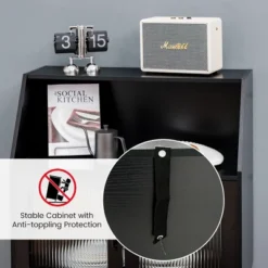 This mid-century modern buffet cabinet combines styles and functions, working well as a space organizer in the kitchen, dining room, living room, etc. With the large storage capacity, including a spacious tabletop, a large open compartment and a 2-door cabinet, the kitchen sideboard can keep household essentials, ornaments and other sundries well organized. And the corrugated tempered glass doors effectively keep the clutter out of sight. What’s more, the side cabinet is a durable and sturdy unit that will accompany you for a long time. With the robust steel legs and anti-toppling device, the bar cabinet can stay upright on the floor without wobbling or tipping over. Besides, there are thoughtful details for a better experience, such as the alloy knobs, magnetic door catches and non-scratch pads.