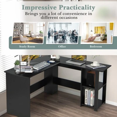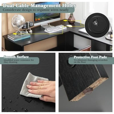 The L shaped laptop workstation is designed to fully utilize vertical space and divide the space into 2 parts for organized working. Also, 2 cable management holes locate on 2 ends to keep wires tidy. Besides, the home office desk also features a 2-tier open shelf for documents, reference books, office supplies and so on. The anti-slip foot pads are able to protect the floor from being scratched. Overall, it’s a comfy and practical addition for office people or students in the living room, bedroom, study room and so on.