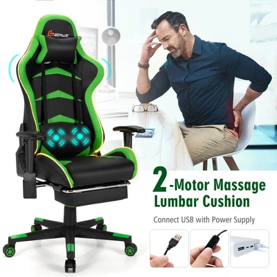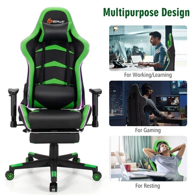 The gaming chair is equipped with adjustable backrest, which allow you to change its angle for different needs and make the chair multipurpose, and retractable footrest, which offers you comfortable foot support when you need to lie down on the chair. The special light of the chair increase a sense of science for you and makes it the most unique furniture in your home, especially at night. Small details like flexible armrests and massaging functions increase the practicability of the chair. Moreover, the ergonomic design and high quality material of the chair all improve your using experience!