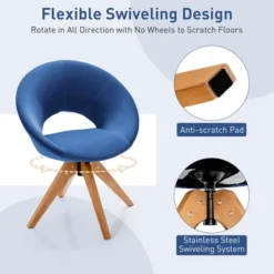 Featuring a thick cushion with high-density sponge filling, this swivel accent chair makes seating pleasant and relaxed. Other comfortable designs like soft flock fabric, oversized seat, and extra-wide hollowed back, enhance the ideal seating experience and ergonomic support. The steel seat frame with 4-claw solid beech legs firmly and stably supports this accent chair. A stainless steel swiveling system enables the chair to rotate in all directions with no wheels to scratch floors. The anti-skid pads will protect your floor. This accent chair works magnificently as a vanity chair, a task chair, or a dining chair.