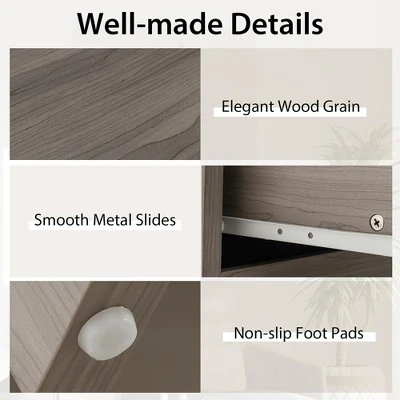 - High-quality Material & Easy Maintenance: Made of high-quality engineered wood with elegant wood grain, the storage dresser has an elegant appearance and a long service life. Its surface is smooth and waterproof, thus is easy to clean.Well-made Details: Each drawer of the closet storage organizer is fitted with smooth metal slides and convenient handle, so that you can pull it out with ease. At the base, there are non-slip foot pads for enhanced stability.
