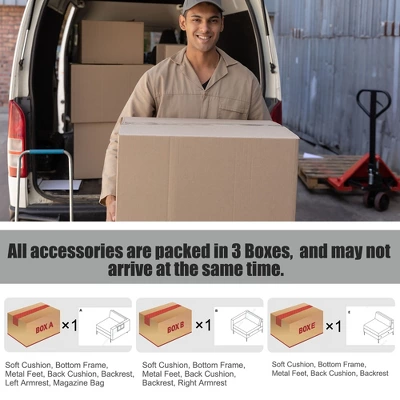 • Shipped in 3 Boxes: This 3-seat sofa couch comes with 3 boxes, so that you may not receive all the packages at the same time. The detailed instruction can guide you step by step through the installation. Overall dimension of the sofa: 94.5” x 32.5” x 32.5” (L x W x H); weight capacity of each seat: 660 lbs.