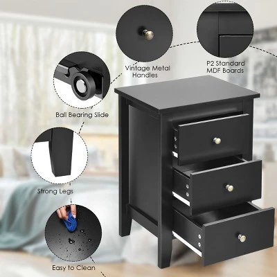 Costway Nightstand End Beside Sofa Table Cabinet W/ 3 Drawers Bedroom Furniture Black