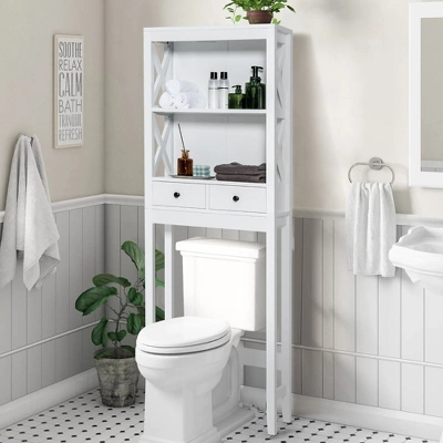 - Plenty of Storage Space: Our over toilet cabinet features 2 open shelves for easy access to items and large drawers that effectively keep out dust and provide privacy. The 3-tier design has provided ample space for you to place and organize toiletries, tissues, towels, potted plants and other items.