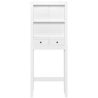 Looking for a bathroom storage cabinet that can store things without taking up too much space? Our over the toilet shelf is designed with three tiers of storage, two open shelves and 2 drawers provide you with plenty of space to place and sort toiletries and sundries. In addition, the back bar at the bottom of the storage shelf can be adjusted to different positions, which is designed for different sizes of toilets. Thus, our storage shelf over the toilet will be a clever addition to small spaces. Considering safety and stability, the bathroom shelf includes two anti-tip devices and four non-slip feet to avoid shaking when using. Made from high quality MDF, our over toilet organizer is strong, durable and easy to maintain for years of use. And its sleek and modern appearance can blend in a variety of bathroom styles.