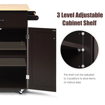 Why not enhance your kitchen area by adding our kitchen island? It would work as a good helper during cooking time or organizing your kitchen area!Our kitchen island will provide additional space for your kitchen wares. The cabinet with two doors and magnet ensures great privacy of your items while preventing from falling off. There are 3 heights levels can be adjusted slightly to fit with your items of different sizes. Place the ingredients on the tabletop, get some condiments on the side to make your food palatable, then wipe dry your hands with towel from the side. Enjoy a great dinner time.