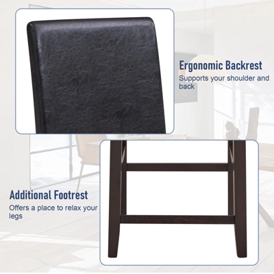 This is our brand new bar stools set designed to keep you comfortable all day. Made of solid rubber wood, these counter height stools are extremely sturdy and durable with a maximum weight capacity of 243lbs. The seats are softly padded with foam and upholstered with PU leather. These ergonomic bar chairs with footrest provide much comfort. The classic expresso finish also accents for an upscale appearance. They are not only perfect for bistros and cafes, but also patios and kitchens to enjoy breakfast, snacks or coffee. Refresh your kitchen space with this vintage bar stools set.
