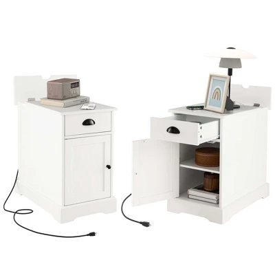 The end table cleverly combines storage and charging station. 2 USB ports and outlets provide power source to support various kinds of electronics, such as tablets, phones, and lamps. Wide tabletop, deep drawer, single door cabinet and magazine holder enlarge storage capacity and classified space for a variety of items. Moreover, the groove on the flip-top cover makes it easy to access to the charging station. Besides, the side table with sturdy construction ensures reliable support and maintains excellent stability. Showcasing clean lines and chic style, this side table with charging station will bring a touch of elegance and warmth to your living space.