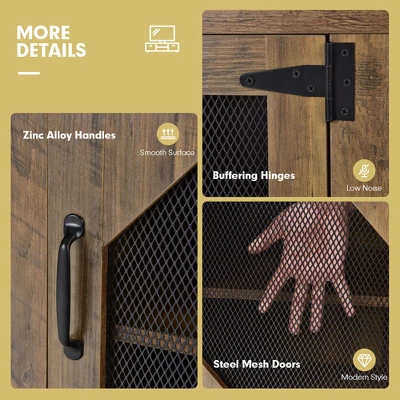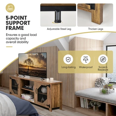 For better quality, the TV stand is made of thicken MDF and rustproof sprayed steel. Both materials positively influence the overall weight capacity (245 lbs). Besides, the entertainment center features an extra steel leg equipped with an adjustable foot pad for better stability. The console cabinet is also a great storage solution. The 58” x 15.5” countertop can hold a 65-inch TV. The 2-layer open shelf accommodate video games. Because of two 3-position adjustable shelves, the internal space of closed compartments is adjustable for more flexible storage. Finally, the TV table comes with some practical details. The steel mesh doors feature buffering hinges and zinc alloy handles for convenient pulling.