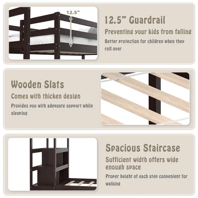 - Wide & Convenient Access: With a 3-step staircase, the twin-over-twin bed frame features an easy access. Both stairs and upper twin bed entrance are 15.5” wide which are spacious enough for your convenient movement. Compared with traditional bunk bed, you can change the quilts and bed sheets more easily.