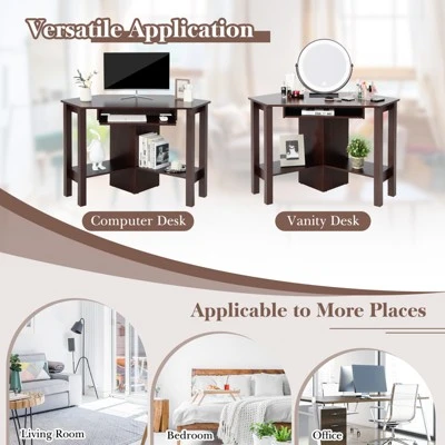 This is our new corner computer desk which is a compact and functional item. Be made of wood ,it is sturdy and durable . Corner design help you maximize your limited floor area. It has a large opening drawer to store your keyboard, And two opening storage space underneath for host computer , miniprinter, books ,CDs and so on. Can be used as study desk, office desk, home office desk workstation and computer desk. This desk compliments any room and is a great addition to any home office