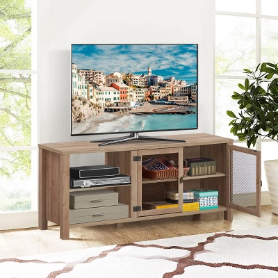 Crafted of high-quality MDF material and 5 sturdy legs, this TV cabinet is stable and durable for long-term use. Spacious desktop will fit up to 65”TVs and some decorations. It is designed with 2-tier open storage shelves and a large cabinet with mesh door, which allow you to place cable box, DVD player, tapes, magazines, etc. With clean line and exquisite appearance, it is suitable for your living room, bedroom, entryway, office and more.