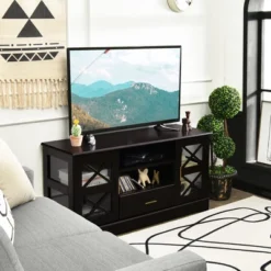 Costway Glass Door TV Stand Entertainment Center W/ Drawer Storage Shelves Brown