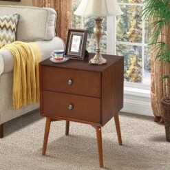 Costway 2PCS Nightstand Mid-Century End Side Table 2 Drawer Rubber Wood Legs Living Room